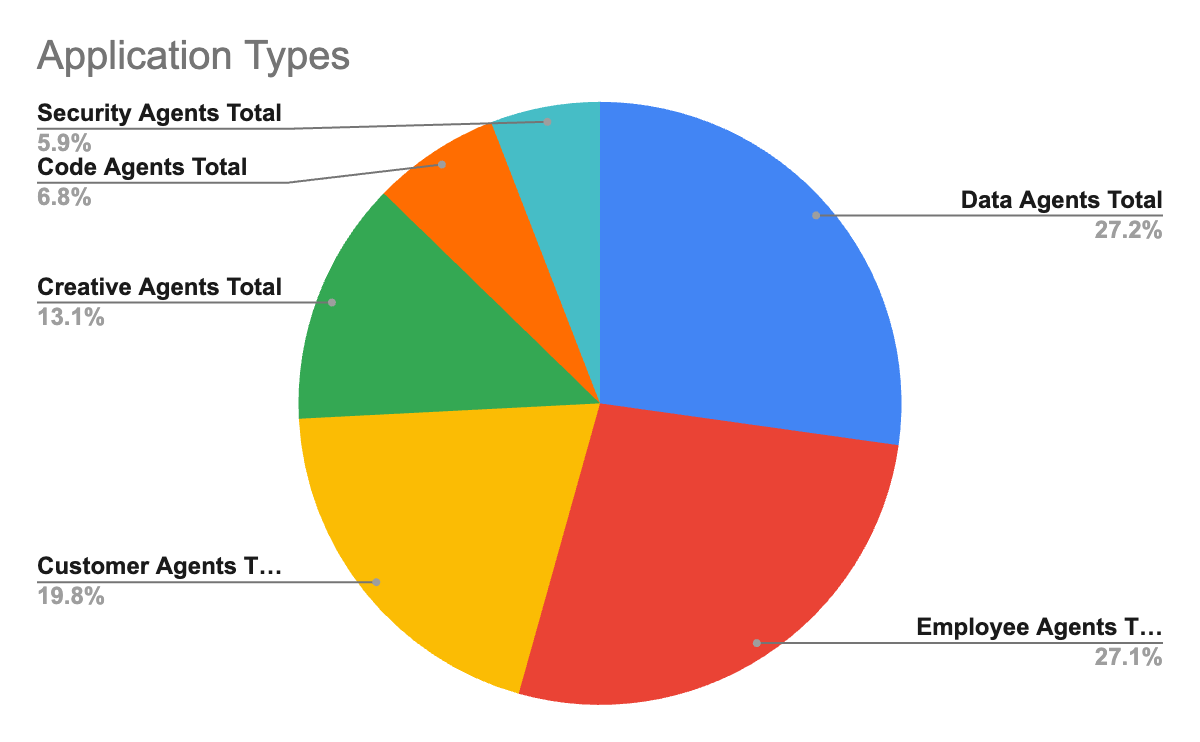 I’ve classified the applications companies have built into six categories. The two most common categories, data agents and employee agents, account for over half of the examples I’ve collected. Data agents include tools for analyzing, forecasting, retrieving data or performing simulations. Employee agents are tools that support workers in drafting documents, automation workflow, and retrieving and summarizing information. Customer agents, which provide customer support, advice, and transactional assistance, among others, are in third place.