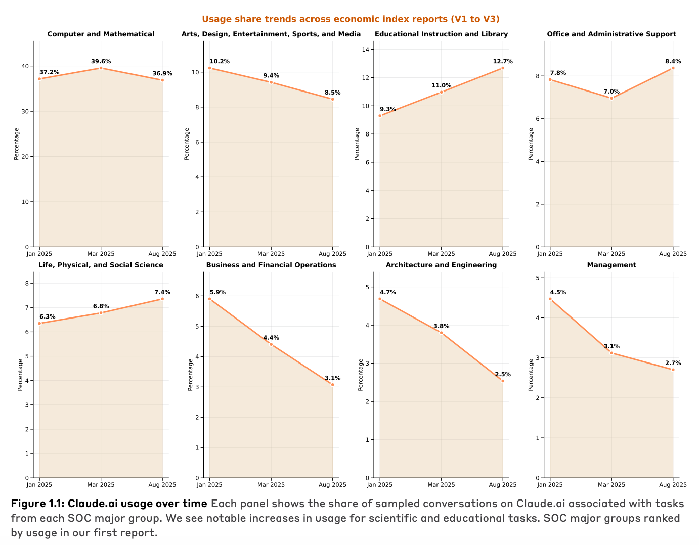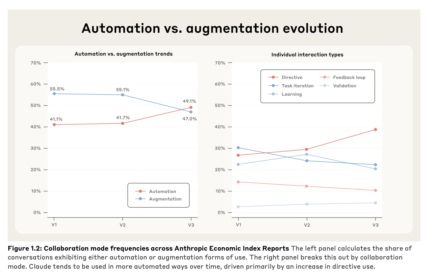 Anthropic doesn’t have as many users or as much revenue as OpenAI. But it seems to be used more intensively for business purposes. Computer and mathematical tasks account for 36% of overall usage, with educational Instruction and Library tasks accounting for 12% and life, physical, and social science tasks another 7%. Anthropic did release data on how its API is used, and found that 77% of business uses involve automation usage patterns, meaning workflows where the AI was expected to complete tasks rather than iterate with humans.