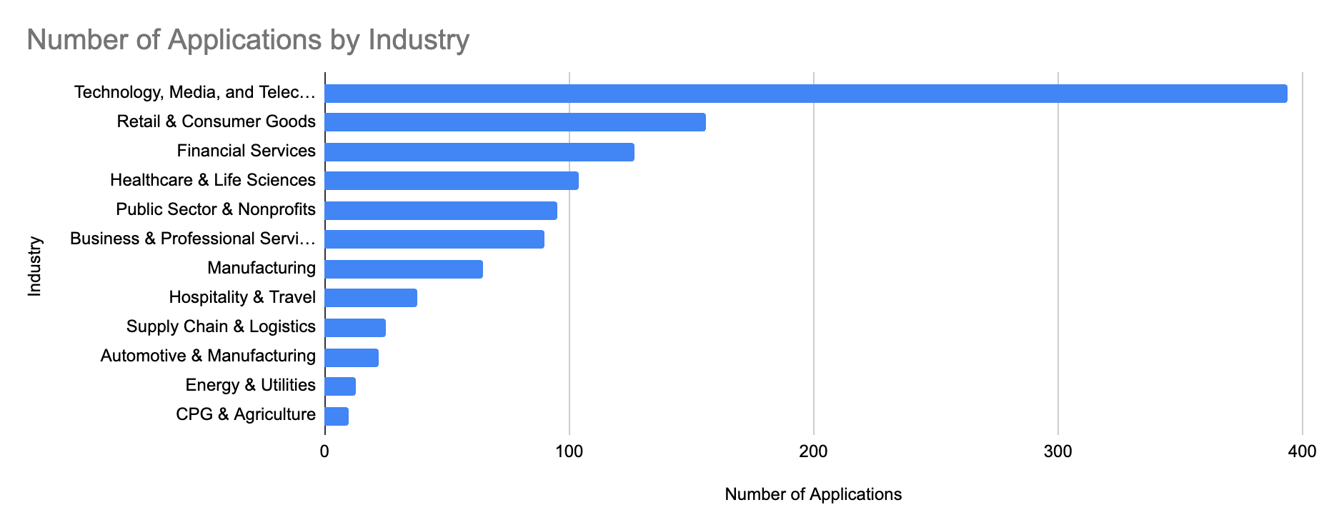 According to my data set, the technology, media, and telecom industry (TMT) has deployed far more AI solutions than any other - twice as many as the #2 industry, Retail & Consumer goods. The distribution of AI apps across these industries reflects, I think, a few factors: