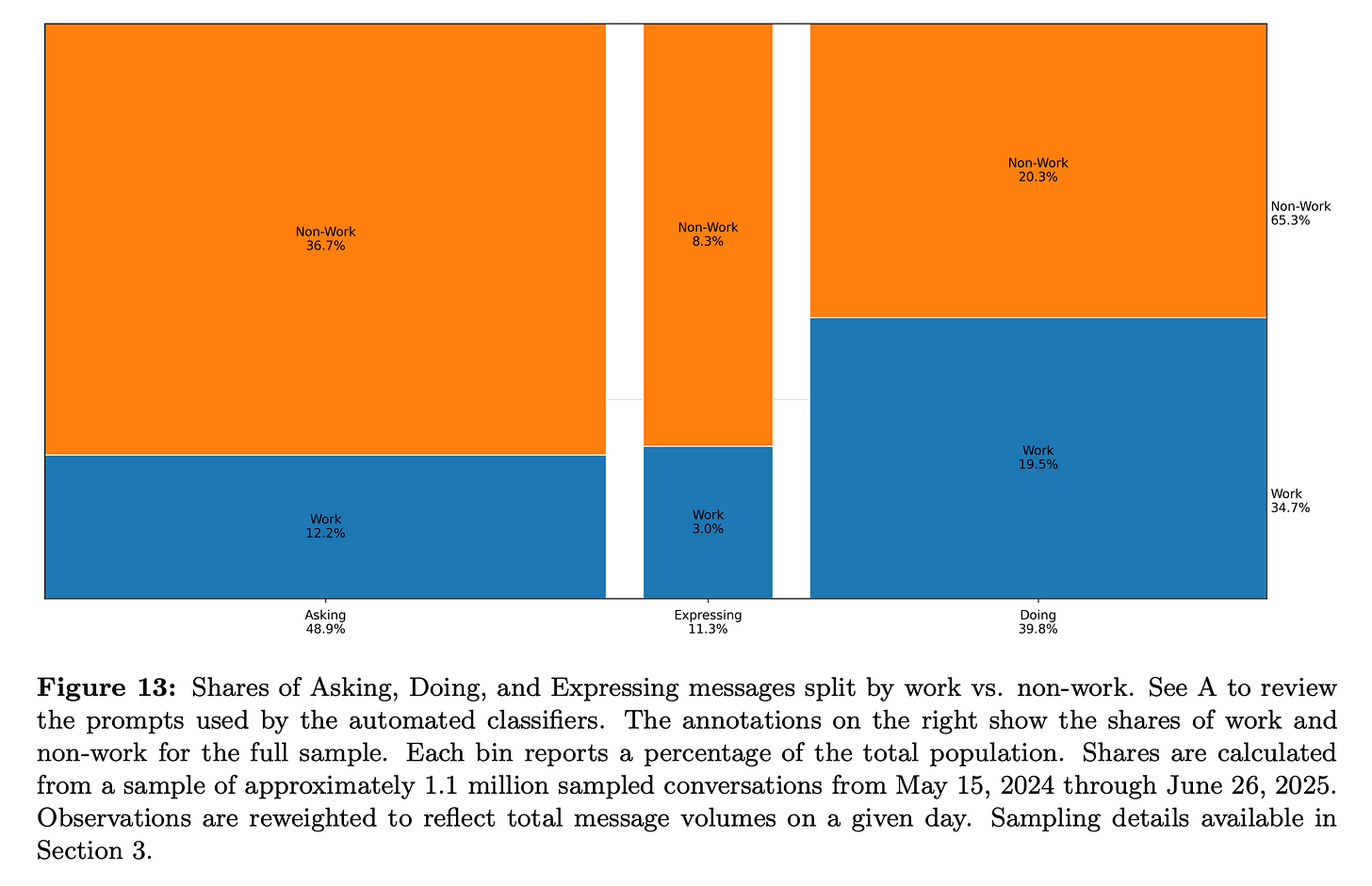 These analyses show that ChatGPT is fundamentally a consumer application, not primarily a business tool. Only a quarter of ChatGPT usage is work-related. Most of that usage—about 81% of work-related messages—”is associated with two broad work activities: 1) obtaining, documenting, and interpreting information; and 2) making decisions, giving advice, solving problems, and thinking creatively.” Used this way, ChatGPT can potentially boost productivity and improve the quality of work. That’s certainly been my personal experience. (I kind of hate how readily Claude and ChatGPT find ways I can improve my writing.) Studies show mixed results on these dimensions, however. And, as I noted above, ChatGPT is not used primarily for work.